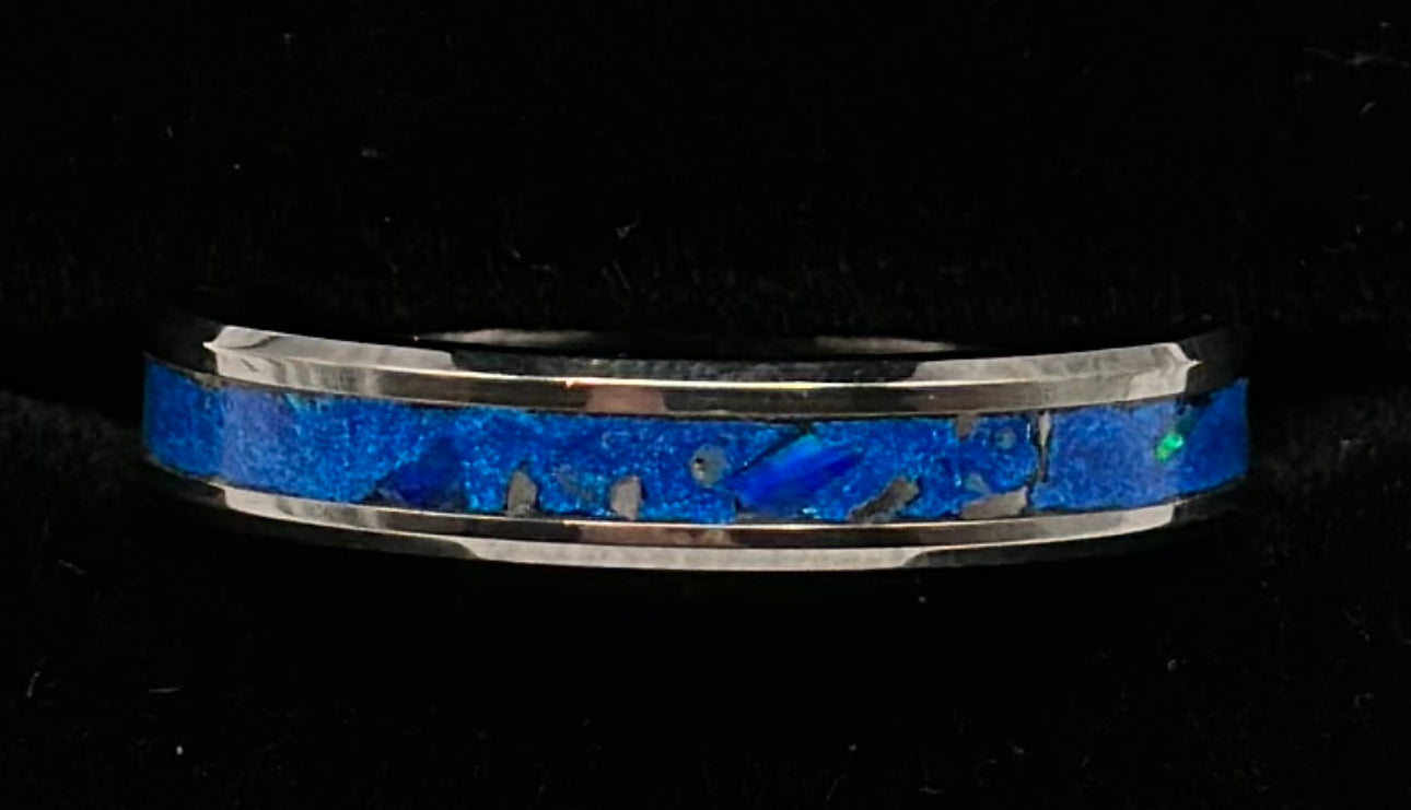 Custom hand made ring to order. Inlay of sapphire blue pigment with Meteorite shavings and Egyptian blue fire opal.